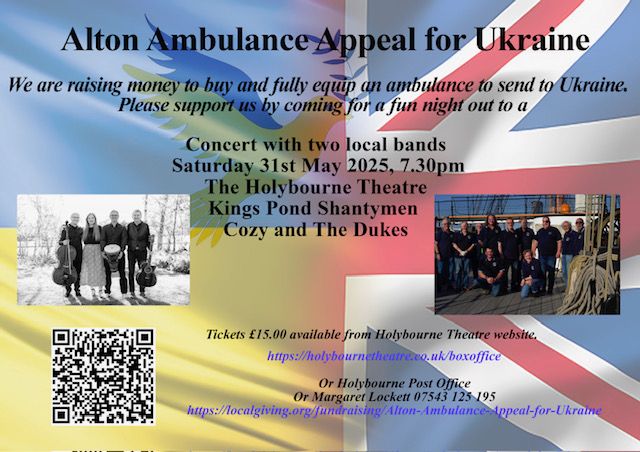 Also we are trying to raise money to send a fully equipped ambulance to Ukraine. There is a fund raising concert on May 31st in Holybourne theatre. 2 bands are performing free of charge. Tickets can be bought from the village shop or online from the theatre. Please help us by spreading the word especially to people not in this group